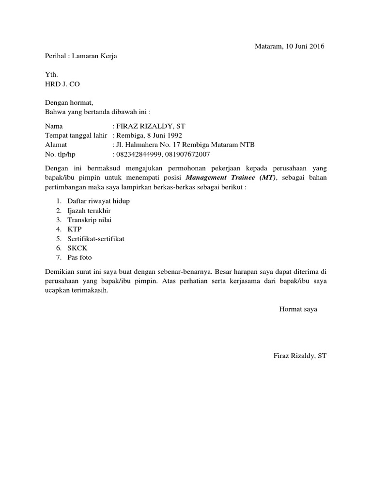Surat lamaran kerja dicantumkan no handphone.
